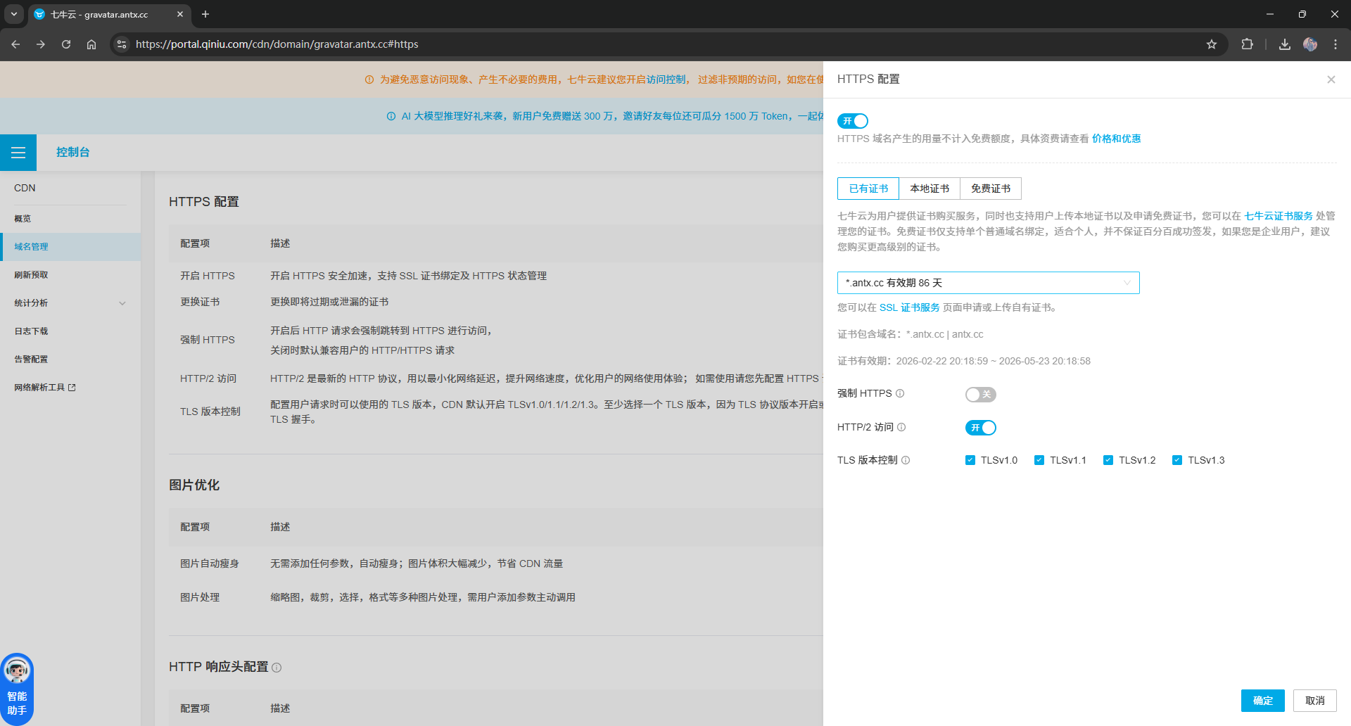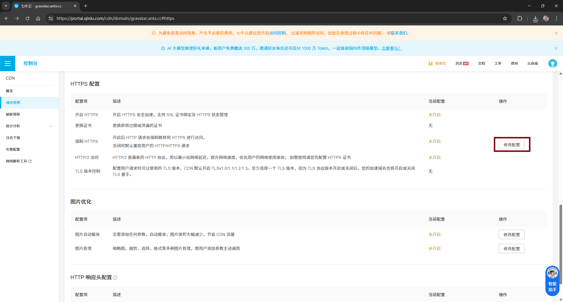 建议开启一下https配置,但是这个是要收费的(其实也不贵),只有http每个月有10GB的免费流量。