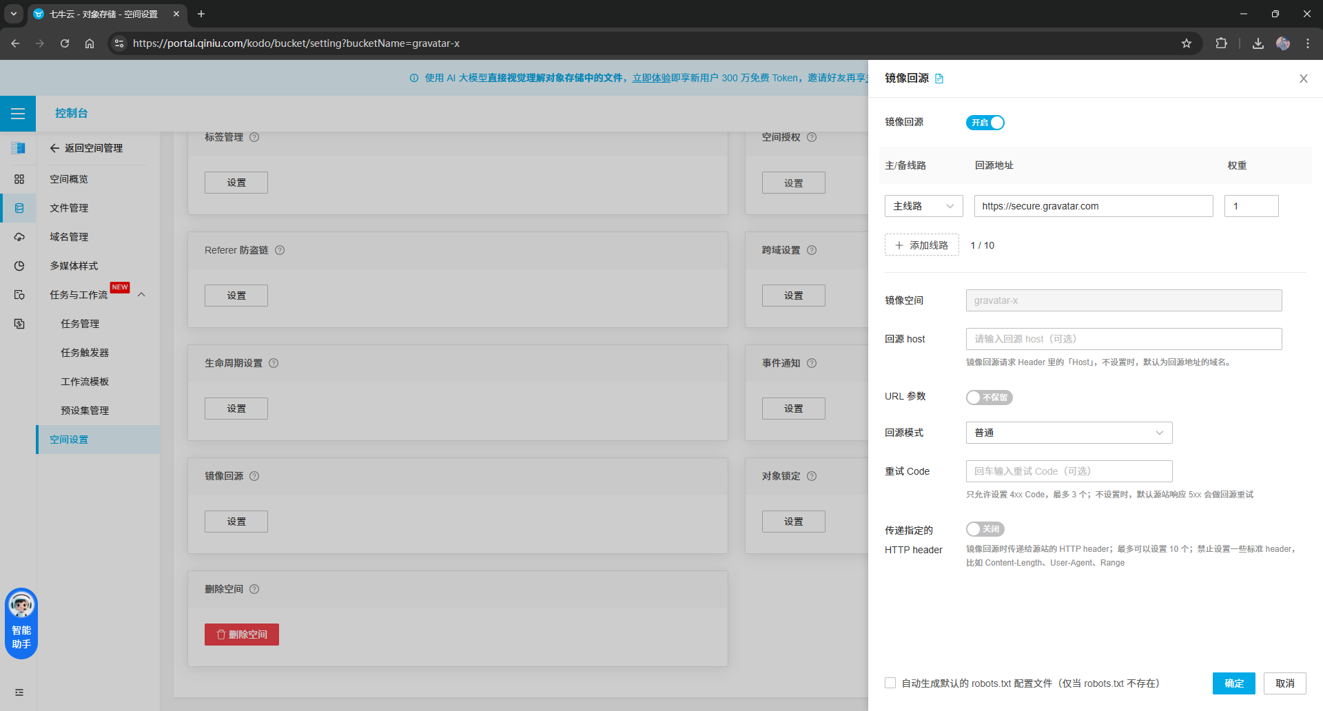 设置镜像回源,添加回源地址:https://secure.gravatar.com,其他的可以不用管。