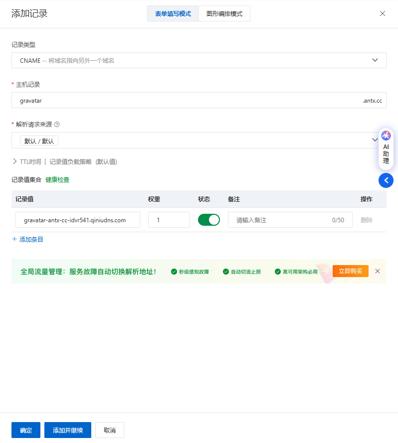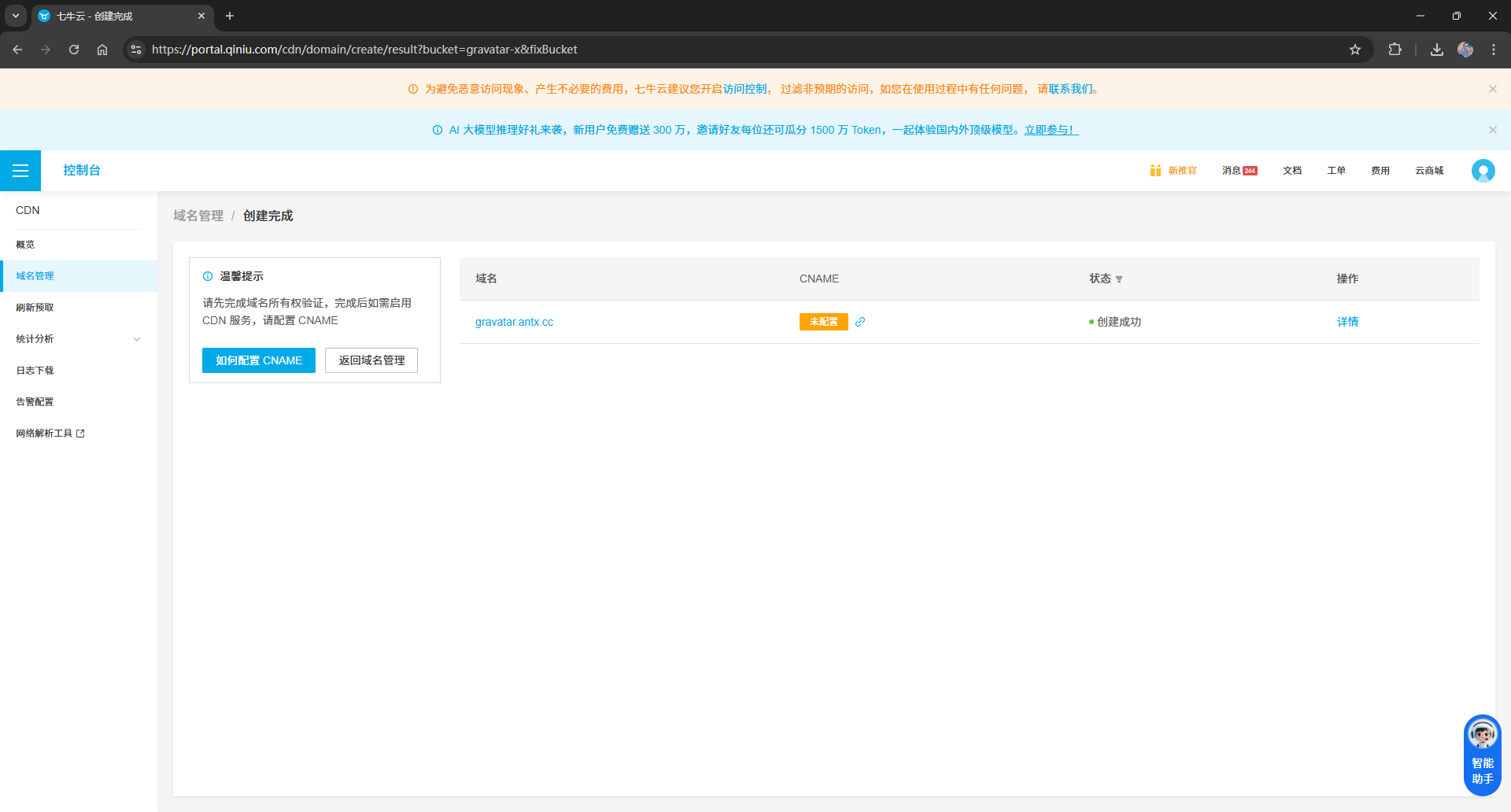 3. 添加完成后要去域名管理平台添加CNAME记录。