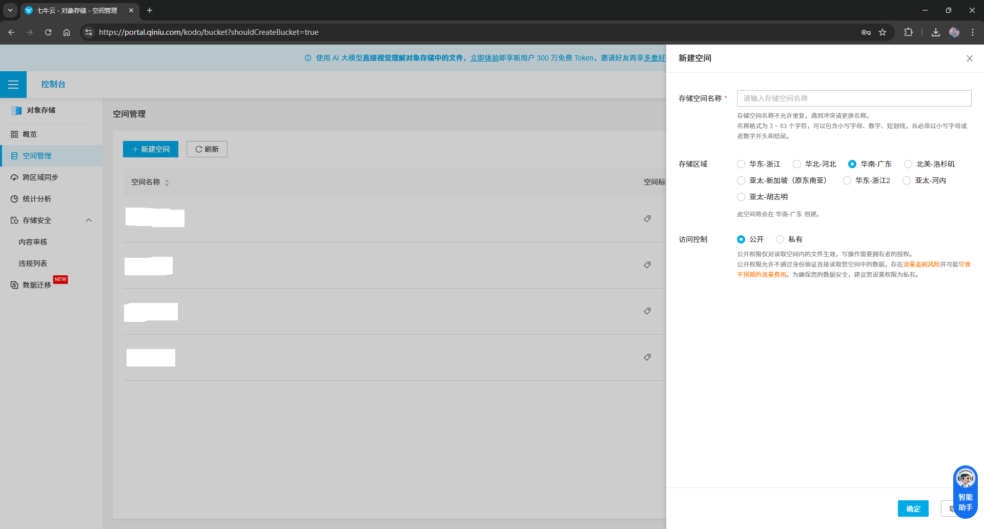 1. 打开对象存储Kodo,进入空间管理,创建一个空间,要把访问控制设置成公开,如果域名没有备案储存区域要选择海外的。